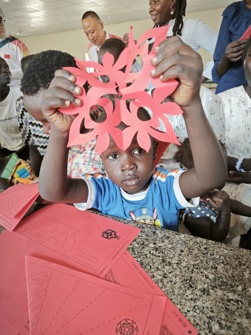 1月23日,时值中国传统小年,中国第十二批援南苏丹医疗队先后前往朱巴孤儿院和“和平之家”孤儿院开展“庆新春,共迎中国年”活动。医疗队向两所孤儿院的孩子们捐赠了饼干、糖果、面粉和饮用水等生活物资。为孩子们讲解中国春节的来历及习俗,介绍剪纸艺术的悠久历史和文化内涵。给小朋友发放剪纸工具,并示范如何剪出各式图案。最终,在队员们手把手地耐心指导下,小朋友们聪明伶俐地剪出一幅幅精美的窗花、栩栩如生的金鱼、各种漂亮的花卉图案、象征着吉祥如意福字等。大家互相欣赏着彼此的作品,现场欢声笑语不断,喜气洋洋,年味十足。通过剪纸活动,让非洲小朋友深切感受到中国传统文化的魅力。活动现场,队员带着孩子们一边贴春联,一边解释春联的美好寓意。一副副喜庆的春联,倒贴的大大的“福”字,不仅寄托着美好愿景,也传递了爱心和温暖。活动中,队员还与孩子们一起游戏互动,为他们带来中国传统新春快乐和美好祝福。孩子们一个个热情高涨,每个孩子的脸上都洋溢着开心的笑容。