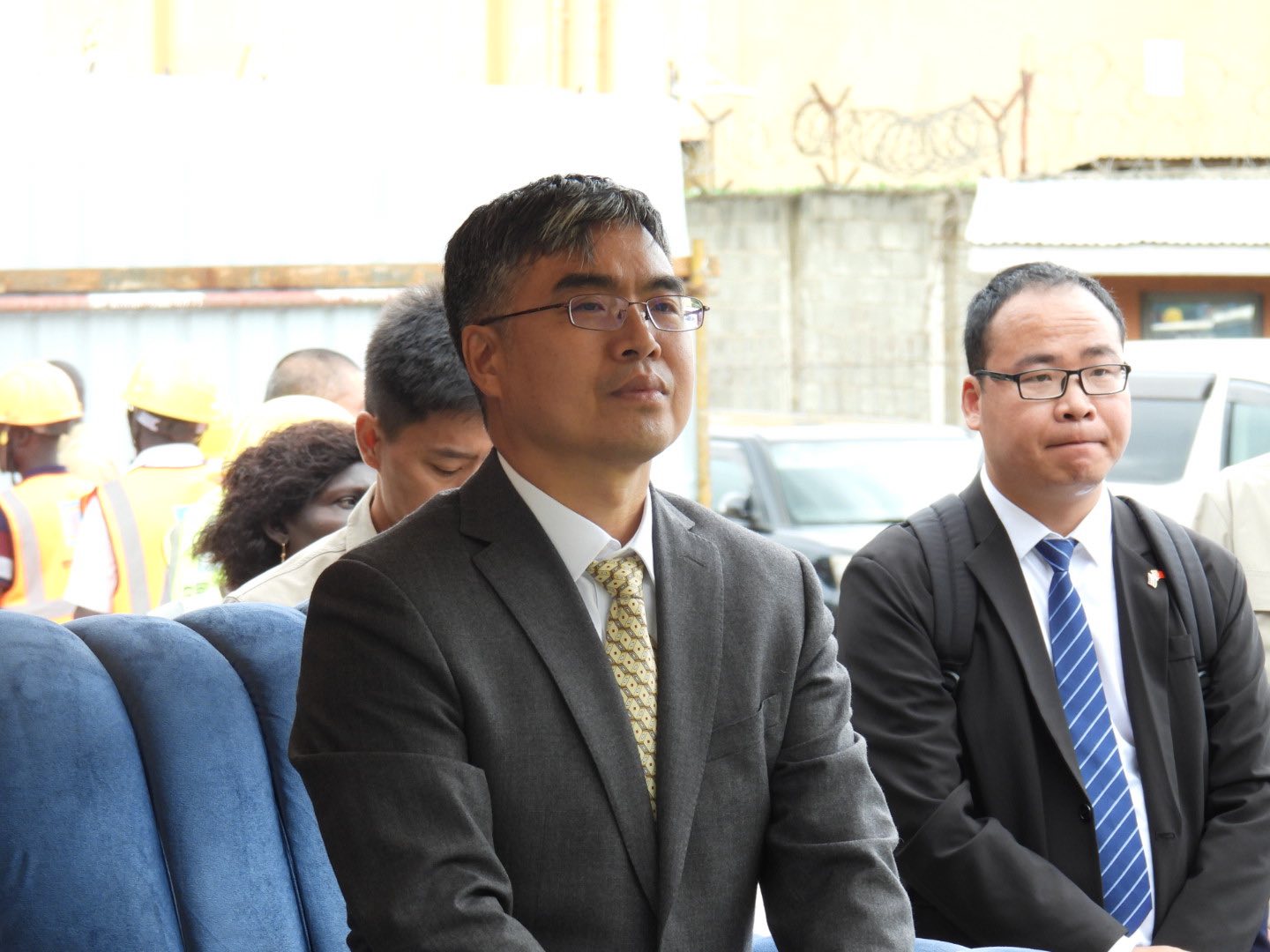 仪式期间,当地人民载歌载舞庆祝医院主体结构封顶。马大使与其他嘉宾一起将混凝土铲入料斗中,共同见证最后一斗料土完成主体结构封顶。随后与会嘉宾共同参观行政楼施工现场。