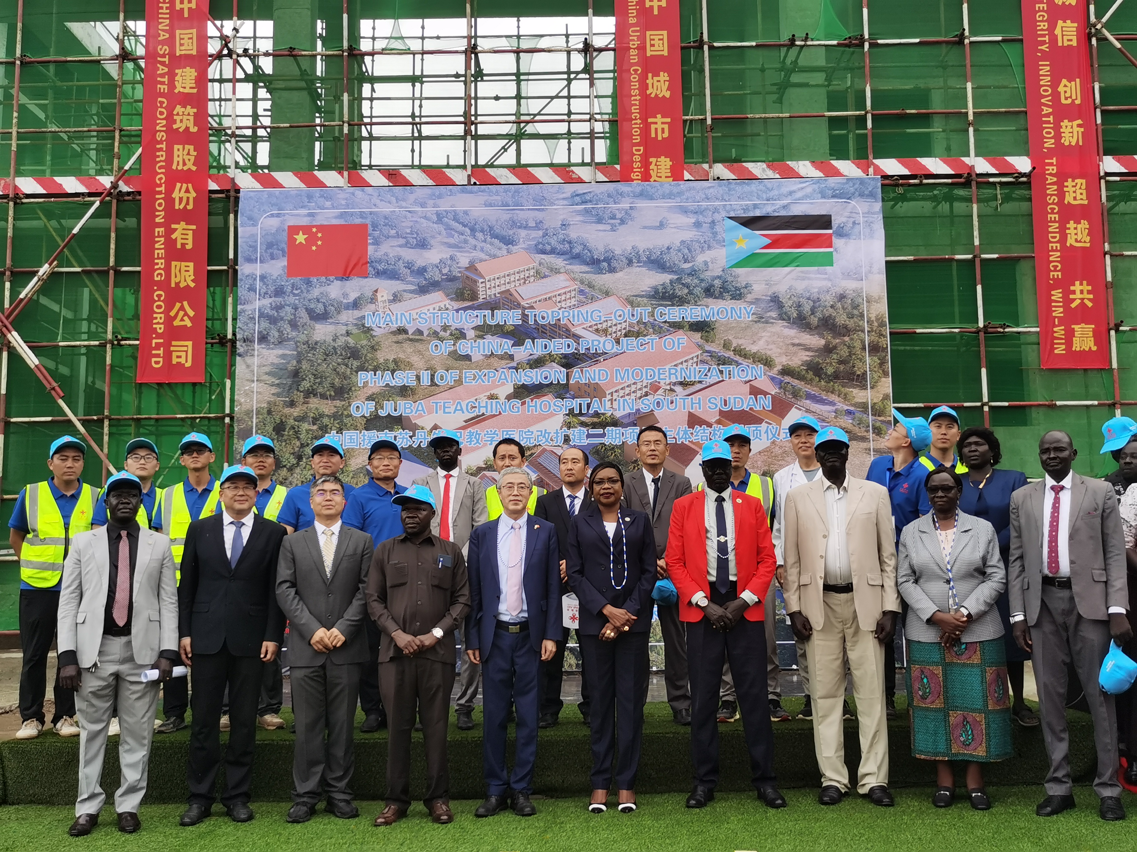 2025年7月1日,中国援南苏丹朱巴教学医院二期项目主体结构封顶仪式在朱巴举行。中国驻南苏丹大使马强、南卫生部长Sarah Cleto Rial、卫生部次长 Annin Ngot Ngot、外交与国际合作部中国司司长Santina Ndefu、TNLA健康与人口委员会主席Benjamin Malek Alier、朱巴教学医院院长Anthony Lupai Simon 出席并致辞。