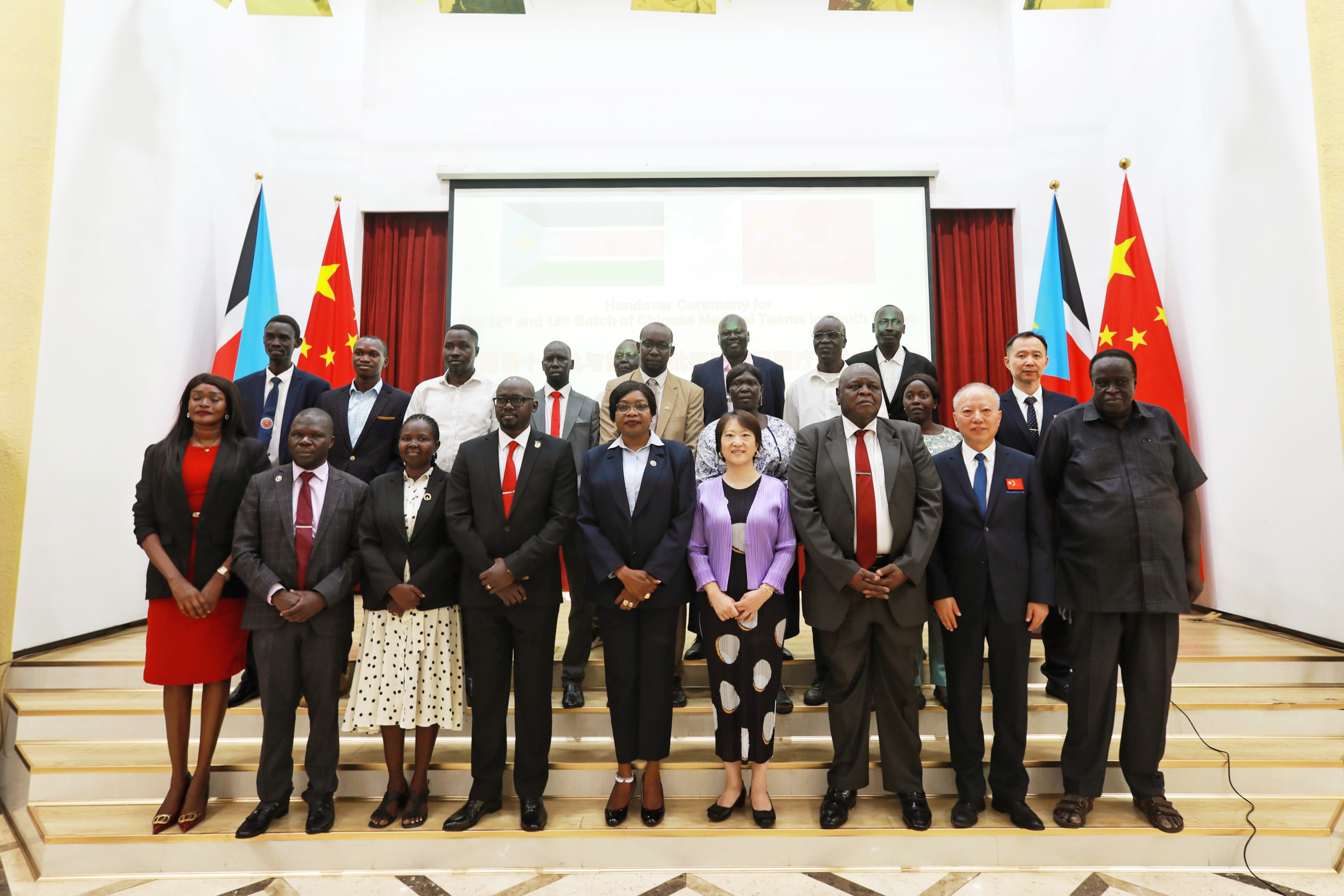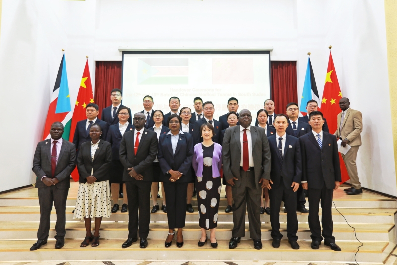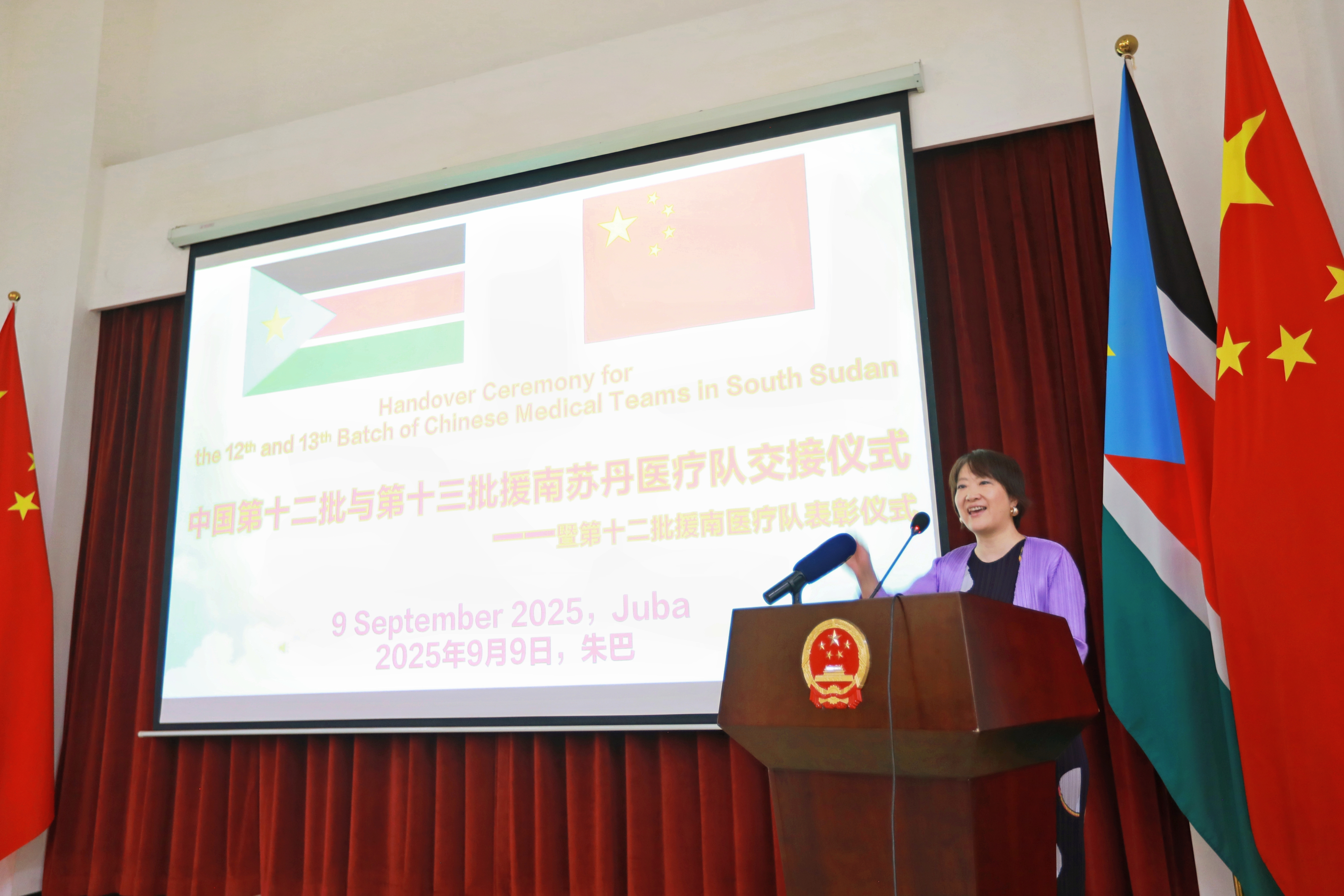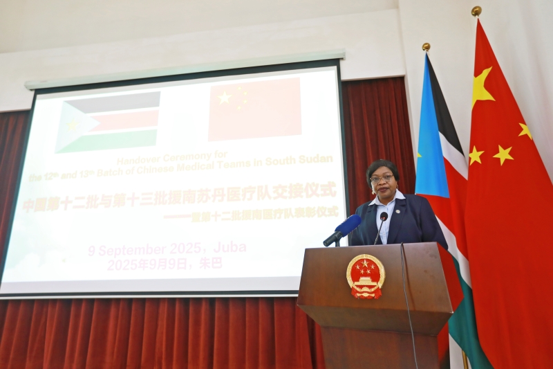 2025年9月9日,中国第十二批与第十三批援南苏丹医疗队交接仪式在驻南使馆举行,霍颖代办、南卫生部长莎拉出席仪式并致辞。